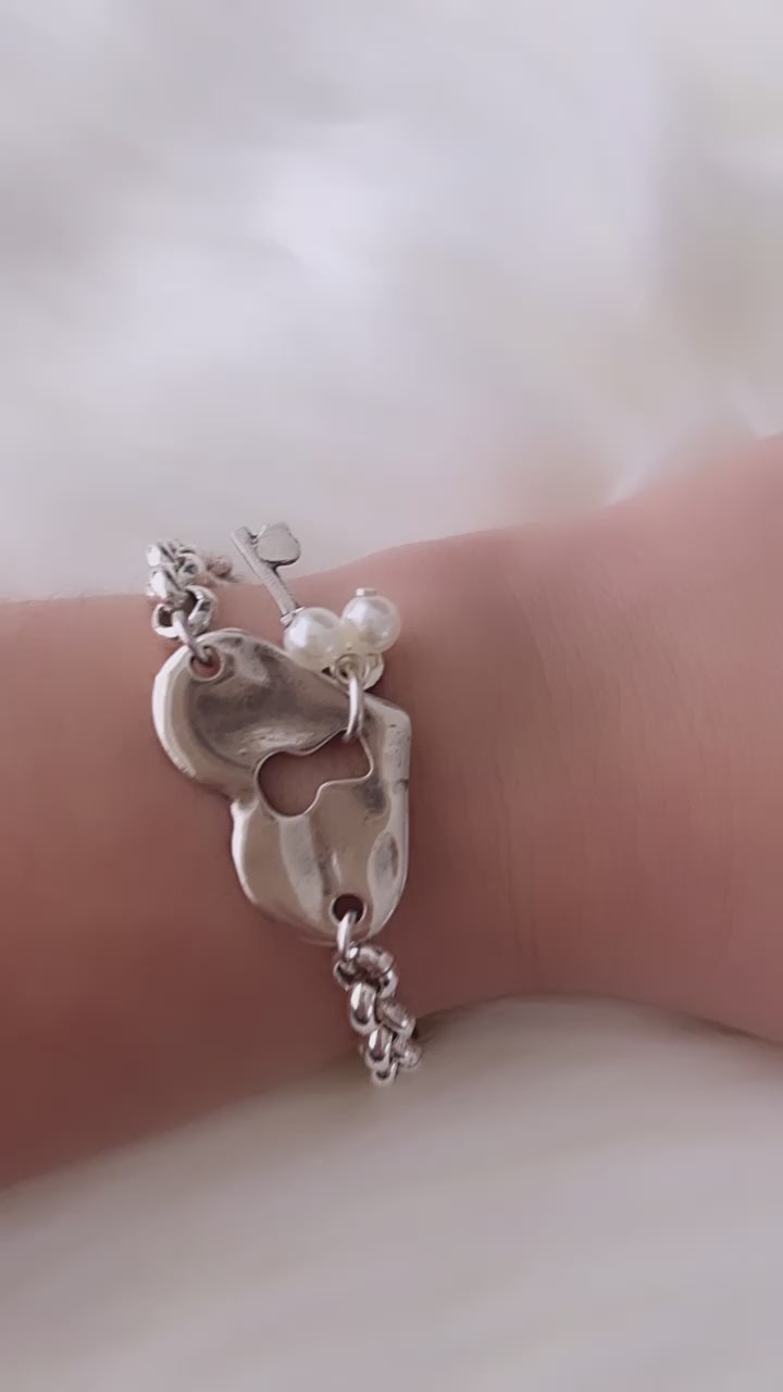 This beautiful rolo chain bracelet contain a heart with a key and pearls in the center.